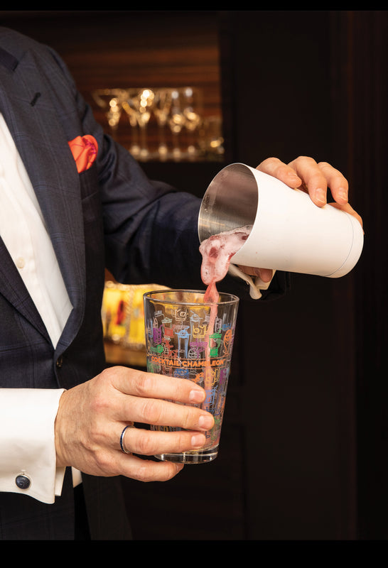 Mark was inspired to create his own Cocktail Party Shaker Set as he set out on yet another 5-city US tour with French silver and crystal retailer Christofe. He needed a reliable cocktail shaker that he could travel with and use for his cocktail demonstrations that featured a wide range of cocktails. His Boston-style shaker set allowed him to shake, stir and roll a wide range of cocktails! The Cocktail Party Shaker Set features a mixing glass printed with the 12 Cocktail Chameleon classic cocktail illustration pattern and accompanied by a white shaking tin and hawthorn strainer and complimentary measuring jigger. This year we have expanded the bar tool collection to include gold and copper Cocktail Party Boston Shakers, which make wonderful gifts for the Cocktail Lovers in your life!